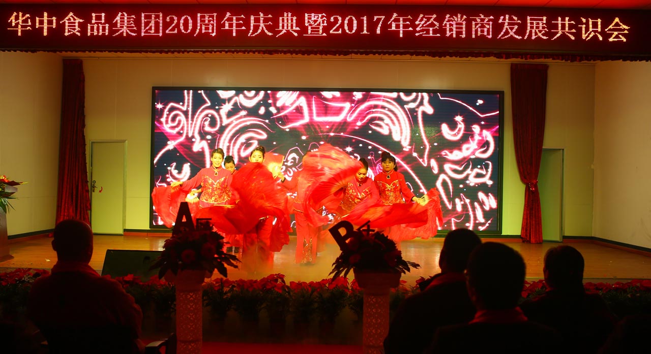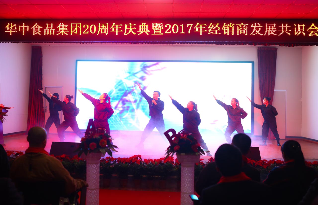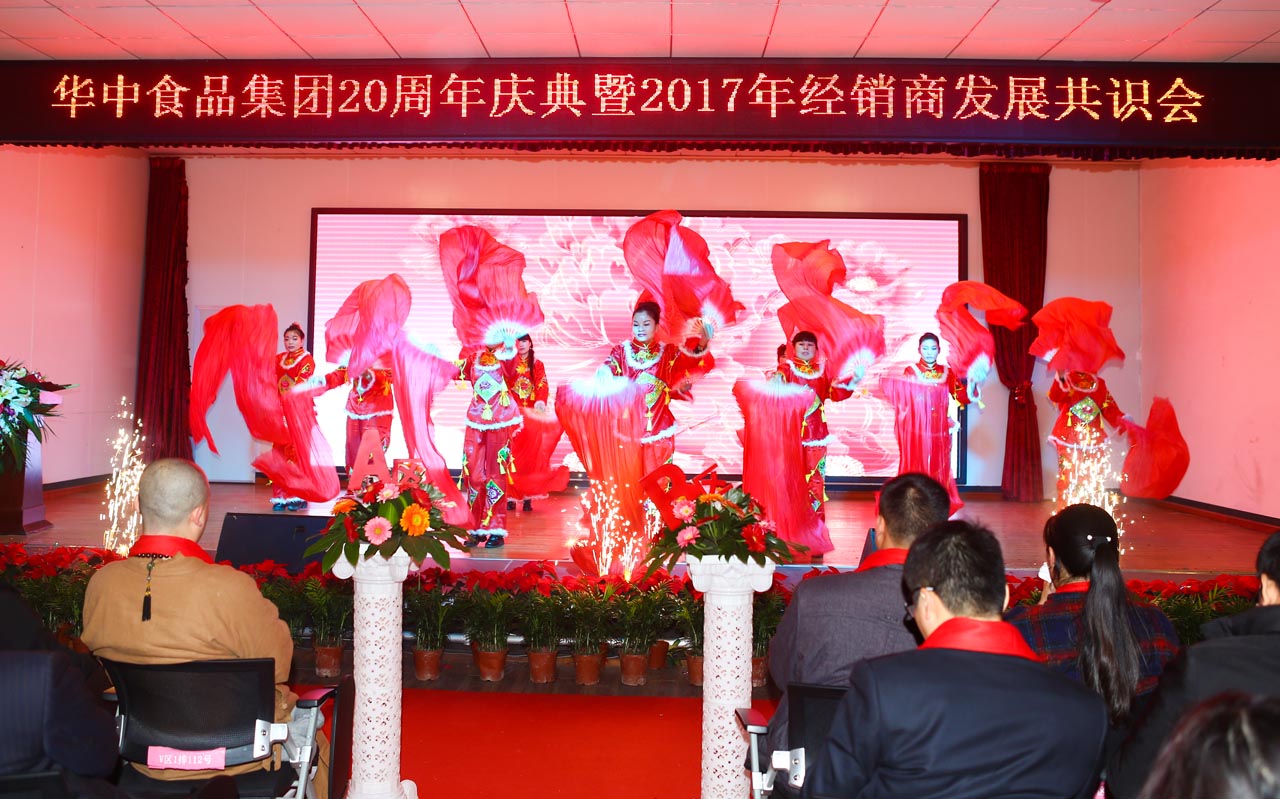 2016年11月21日上午, 華中食品集團在其下屬河南華中食品有限公司成功舉辦了集團20周年慶典,在一片紅色喜慶的氛圍中,集團邀到全國各地的優秀經銷商和供應商、業界精英以及優秀企業家們參與了慶典;慶典中集團董事長張新建與大家分享了華中食品集團的成長經歷,同時特邀嘉賓洞林寺主持釋延若也與大家分享了“佛教與商道”等文化大餐,一支舞蹈開門紅拉開了慶典序幕,會場現場載歌載舞,精彩節目接連不斷,與會人員聚精會神地欣賞著 公司員工為集團慶典的召開準備的歌舞盛宴,慶典以舞蹈節目“歡聚一堂”的結束而圓滿結束。