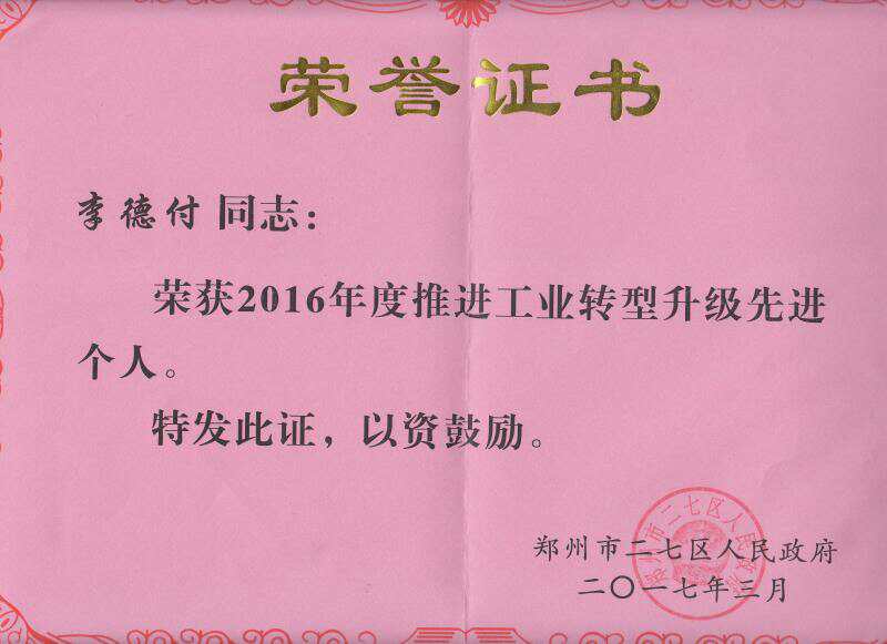 熱烈慶祝 華中食品李德付同志榮獲2016年度推進工業轉型升級先進個人,受到鄭州市二七區人民政府以政府公文的形式進行高度的宣傳,表彰!我們衷心的向李總表示祝賀!